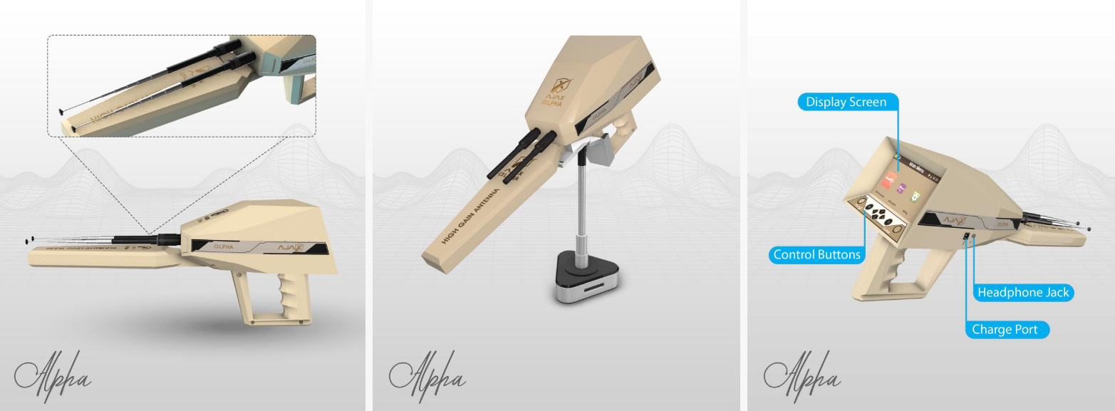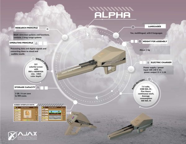 ?Alpha是遠程檢測設備。經(jīng)過在美國,歐洲,亞洲和非洲的尋寶者進行了必要的實驗,并證明了其在確定遠距離2250米和地下50米深度目標方面的效率,它包括現(xiàn)代規(guī)范,智能和操作檢測系統(tǒng),只有AJAX Alpha才在提供。