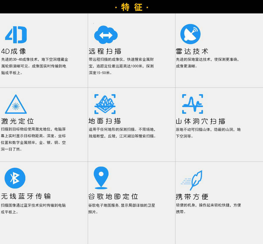 ASV質(zhì)子遠(yuǎn)程4D成像探地雷達(dá)M2(軍用版),功能強(qiáng)大,先進(jìn)的遠(yuǎn)程追蹤成像探地雷達(dá),用于地下埋藏的金屬寶藏,瓷器,珠寶,隧道,隱蔽的山洞,地下空洞的快速搜索,原地不動(dòng)掃描成像遠(yuǎn)距離1000米,掃描成像深度根據(jù)探測(cè)目標(biāo)物的不同15-50米,不限場(chǎng)地,殘?jiān)珨啾冢瑓擦謽淠荆鹆晟絽^(qū),江,河,湖泊水下金屬寶藏索搜掃描,(紅色代表金屬寶藏,藍(lán)色代表地下空洞,深蘭色六角或者菱形代表珠寶,鉆石,寶石,綠色代表土壤環(huán)境參考值)儀器電腦屏幕實(shí)時(shí)顯示物體目標(biāo)的距離,深度,電腦 軟件自帶位置坐標(biāo)定位,激光定位,屏幕左邊的數(shù)字頻率實(shí)時(shí)顯示是金,銀,銅,空洞,一目了然,操作簡(jiǎn)單,攜帶方便,