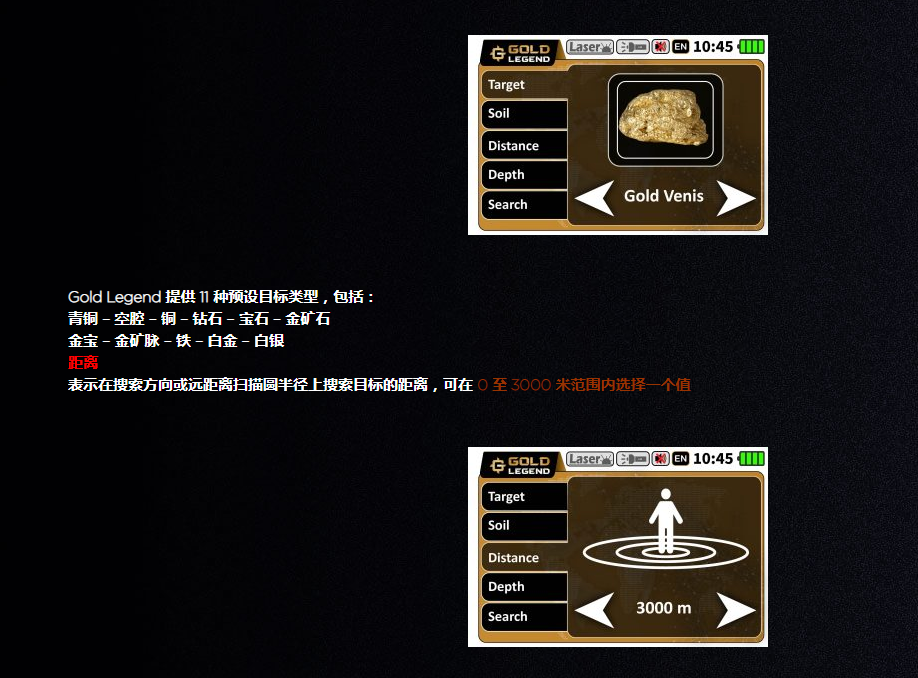 黃金傳奇特點(diǎn) 5 搜索系統(tǒng) Gold Legend 金屬探測器設(shè)備包括五個(gè)不同的集成搜索系統(tǒng),為用戶提供了一種簡單的方法來檢測地下埋藏目標(biāo)、了解其確切位置并估計(jì)其所在深度。 該設(shè)備中包含的五個(gè)搜索系統(tǒng)包括: 1 – 遠(yuǎn)程系統(tǒng) 2 – 自由模式系統(tǒng) 3 – 智能深度系統(tǒng) 4 – 離子系統(tǒng) 5 – 仿生系統(tǒng) 可以從主菜單輕松選擇搜索系統(tǒng),以下是每個(gè)系統(tǒng)的詳細(xì)選項(xiàng)。 1 – 遠(yuǎn)程系統(tǒng) 遠(yuǎn)程搜索系統(tǒng)采用技術(shù)開發(fā),可確保遠(yuǎn)距離探測深層金屬物體和埋藏寶藏,并提供土壤、目標(biāo)類型和距離范圍等定制搜索選項(xiàng),以獲得可靠的正確結(jié)果。 Gold Legend中的遠(yuǎn)程系統(tǒng)工作原理取決于產(chǎn)生無線電頻率并通過安裝在主機(jī)前面的兩個(gè)天線發(fā)送和發(fā)送它們,當(dāng)設(shè)備產(chǎn)生的無線電頻率擊中潛在目標(biāo)時(shí),設(shè)備開始向目標(biāo)旋轉(zhuǎn)手柄周圍。