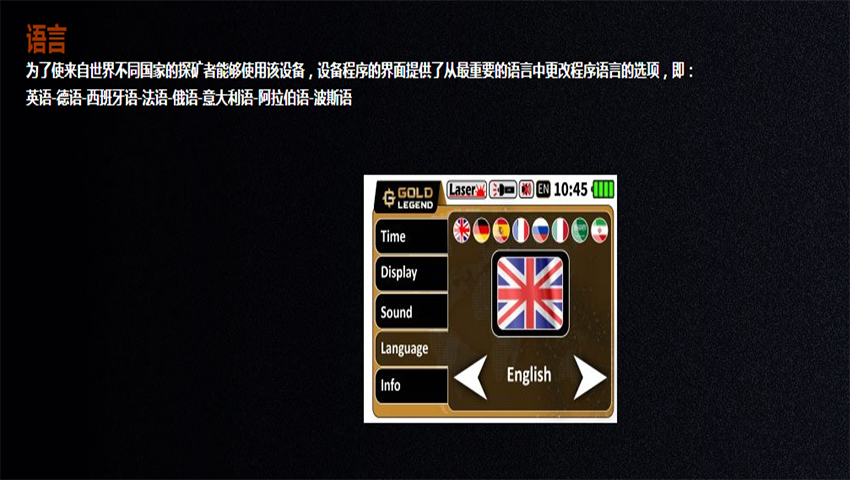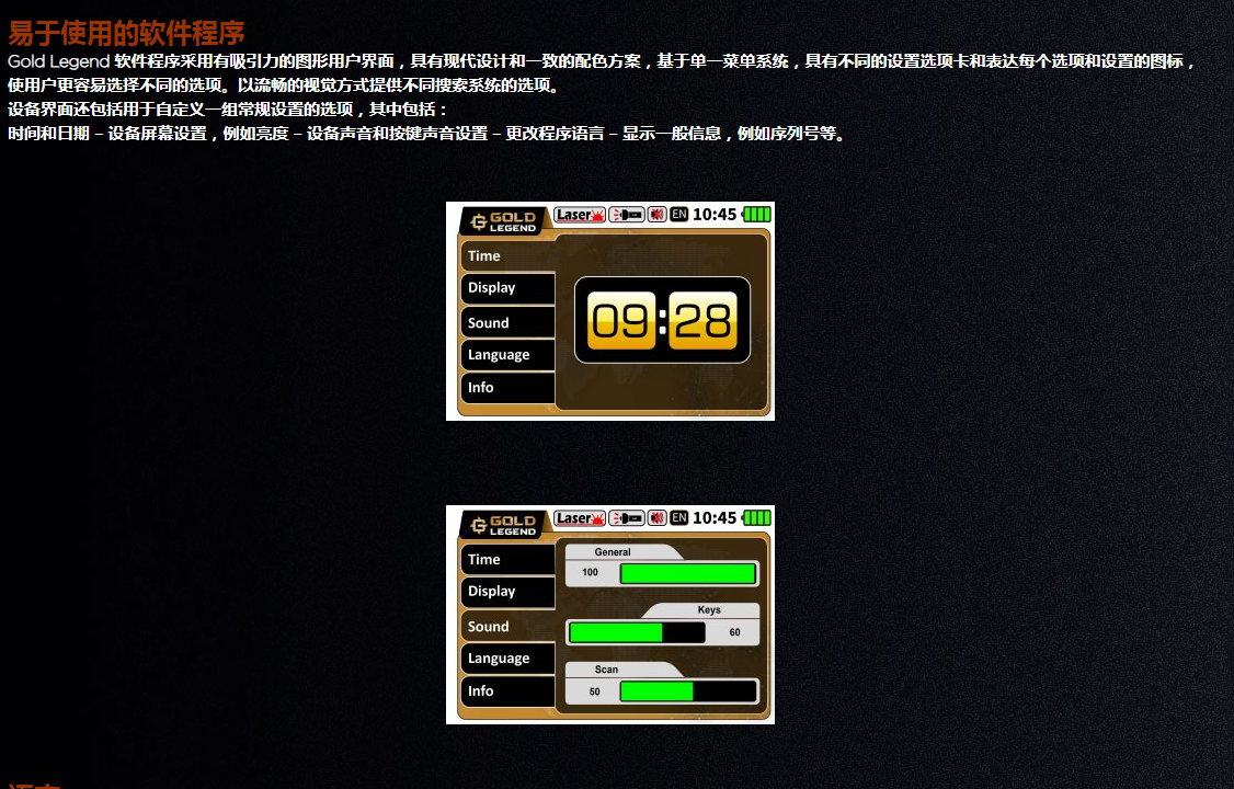 概述 Gold Legend 是一款小型且易于使用的金屬探測器,通過簡單的程序提供了一個(gè)簡單的工具來選擇搜索系統(tǒng)、調(diào)整其設(shè)置并在設(shè)備的彩色屏幕上以簡化的視覺方式查看結(jié)果。 Gold Legend 因其易用性而成為初學(xué)者和探礦者推薦的設(shè)備,構(gòu)成了探測者的金屬探測器。 黃金傳奇應(yīng)用與用途 銀、銅、鉑、鐵等各種金屬及其礦物的檢測 檢測黃金和黃金制成的埋藏物品,例如金幣和手鐲、戒指和耳環(huán)等裝飾性珠寶 ,如青銅、銀或金器皿和杯子等。