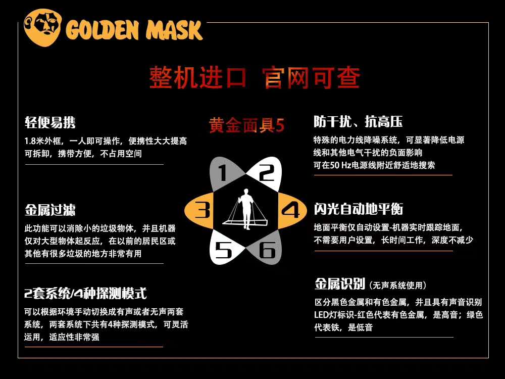 黃金面具pro5深度獵人是一個脈沖感應(PI)金屬探測器,大深度抗高壓脈沖探測器,在探測深埋中大型金屬物體。Deep Hunter Pro具有簡單直觀的控制和功能:動態(tài)自動調(diào)諧、靜音識別模式、裂紋控制和增強模式,性能優(yōu)于同類任何其他脈沖檢測器。與金掩模系列的其他金屬探測器一樣,DHP具有高度的靈敏度、可靠性和穩(wěn)定性。物體的類型由兩個LED燈識別——紅色表示有色金屬,綠色表示鐵。與同類機器相比,DHP的主要特點是它能夠在頻率為50赫茲的高壓電線附近工作。防干擾、抗高壓,自動地平衡,機器實時跟蹤地面.不需要用戶設(shè)置,長時間工作,深度不減少,種探測模式,有聲或者無聲,系統(tǒng),兩套系統(tǒng)下共有4種探測模式,可靈活.運用,適應性非常強.